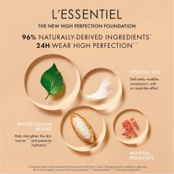 A foundation made with 96% naturally-derived ingredients* with a natural matte finish and high coverage that lasts for 24 hours**. The texture is comfortable and lightweight, leaving the complexion natural and flawless all day long. Pores and imperfections are blurred. With L’Essentiel, bare skin is more beautiful, day after day. The formula lets skin breathe while preserving its natural hydration and protecting it from daily external aggressors such as UVA and UVB.